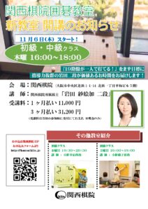 関西棋院 囲碁教室 新教室開講のお知らせ 「初級・中級教室」 11月6日(木)スタート 毎週木曜 16:00~18:00(第5週、祝日等除く) 講師:岩田二段 目安として20~5級の方におすすめ。 上級教室 11月4日( […]