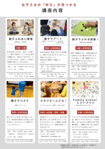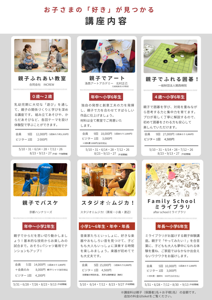 対 象:4歳~小学6年生 と 保護者1名(別途追加可能・・・《大人1名追加》3,000円《子ども1名追加》1,500円)